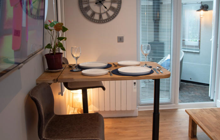 Comfortable seating and eating area with wall mounted TV and access to Garden Room.
